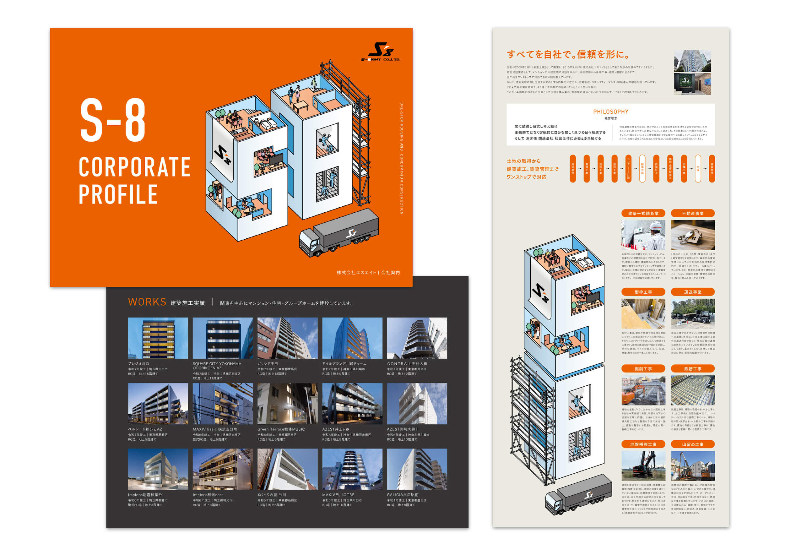 建築に関わる企画から施工、管理までを一貫して担うワンストップ体制というエスエイトの強みを、情報とビジュアルの両面から分かりやすく表現した会社案内に仕上げています。